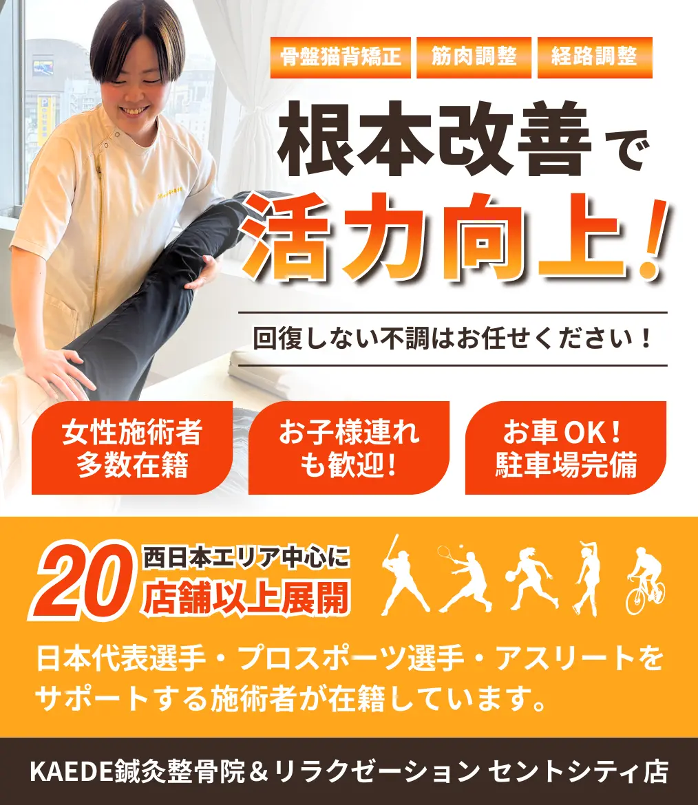KAEDE鍼灸整骨院&リラクゼーション セントシティ店では毎日20時まで営業しているため、仕事終わりの方や、部活終わりの学生さんも通いやすくなっております。なかなか治らない身体の痛みでお悩みの方は、お気軽にご相談ください。