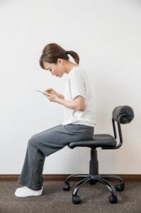 肩が内側に入る「巻き肩」や、背中が丸まる「猫背」の状態が定着しています。